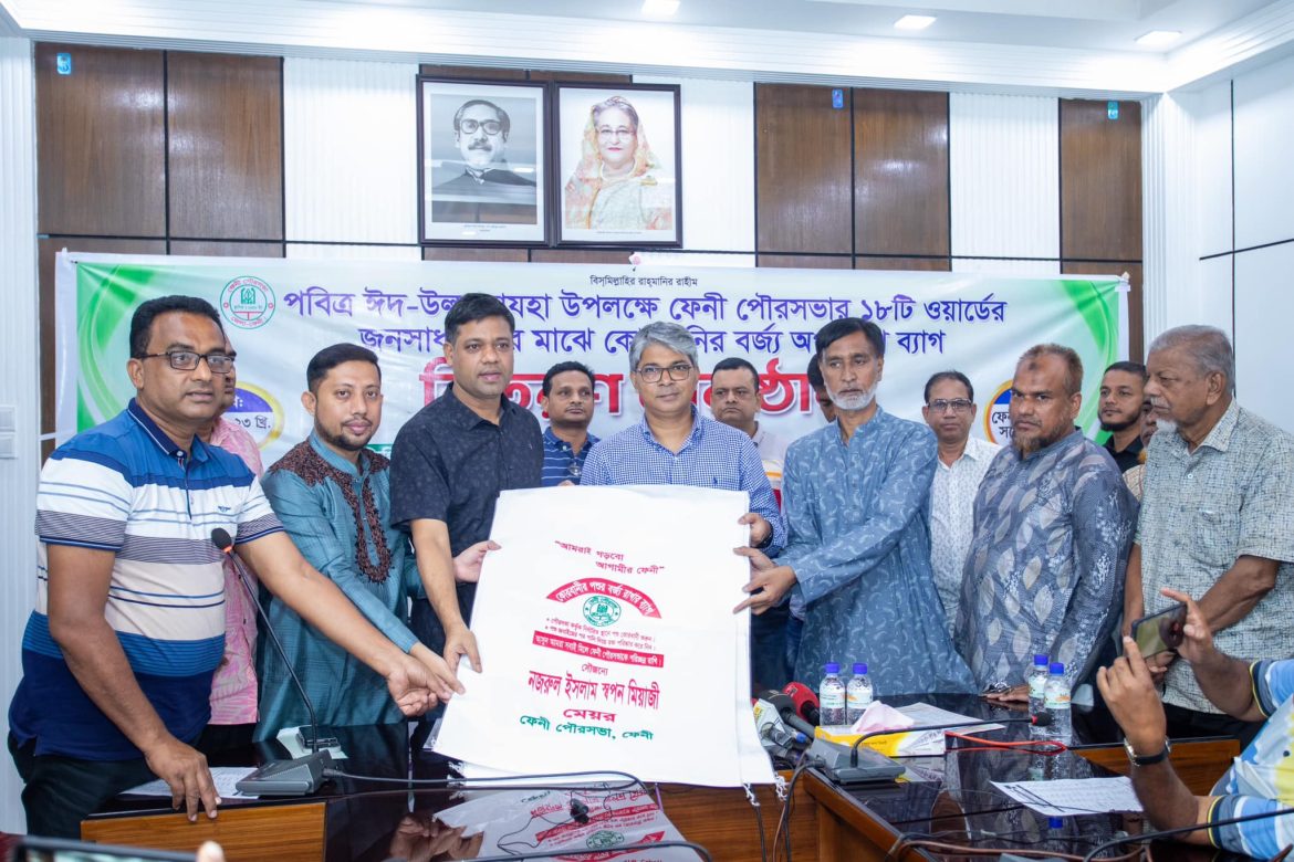 ফেনী পৌরসভায় কোরবানির বর্জ্য অপসারণ ব্যাগ বিতরন অনুষ্ঠান রোববার দুপুরে পৌরসভার হল রুমে মেয়র নজরুল ইসলাম স্বপন মিয়াজির সভাপতিত্বে অনুষ্ঠিত হয়েছে।